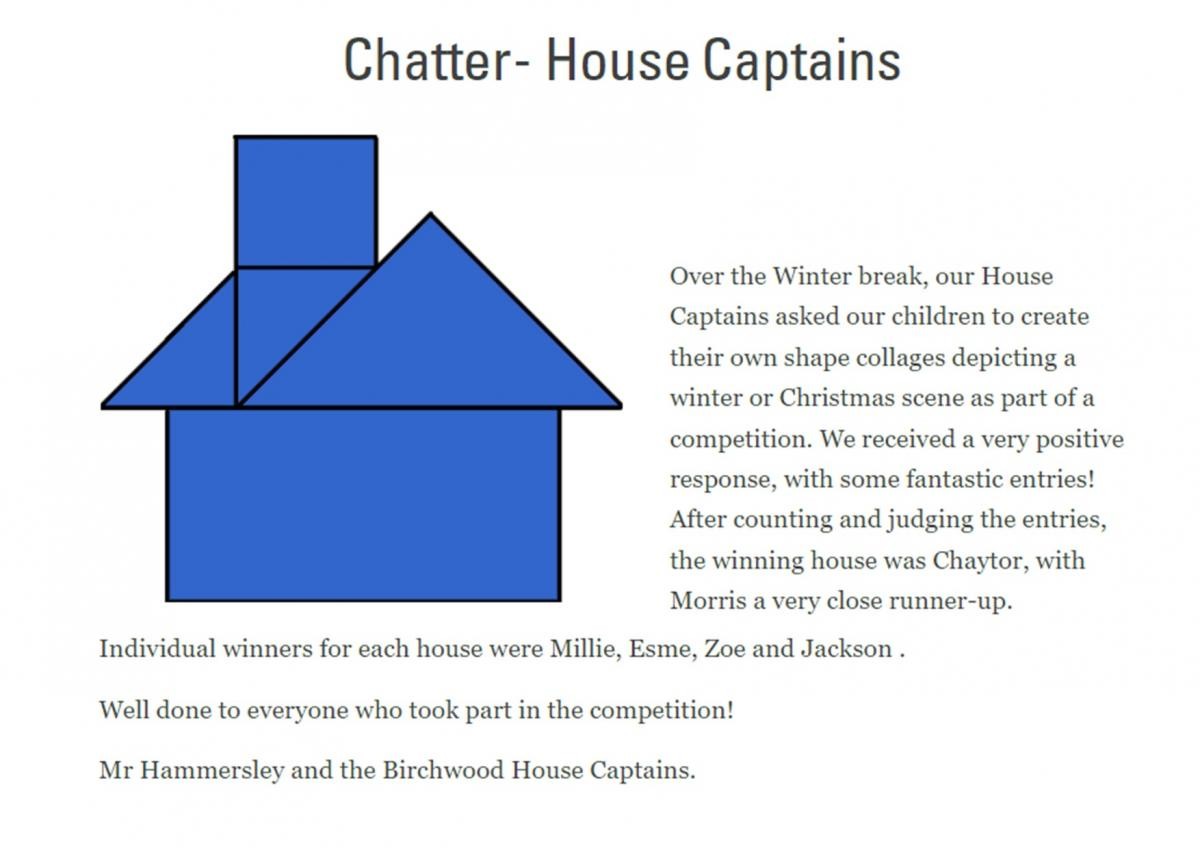 Hello again from the Birchwood House Captains! Another super competition is now complete, with a staggering number of entries from across both key stages. In total, we had over 100 entries to judge - all of them showing a fantastic level of creativity and artistic skill. It was extremely difficult to judge the winners from each house as everybody did so well. However, there can only be one winner, so here are the results:
